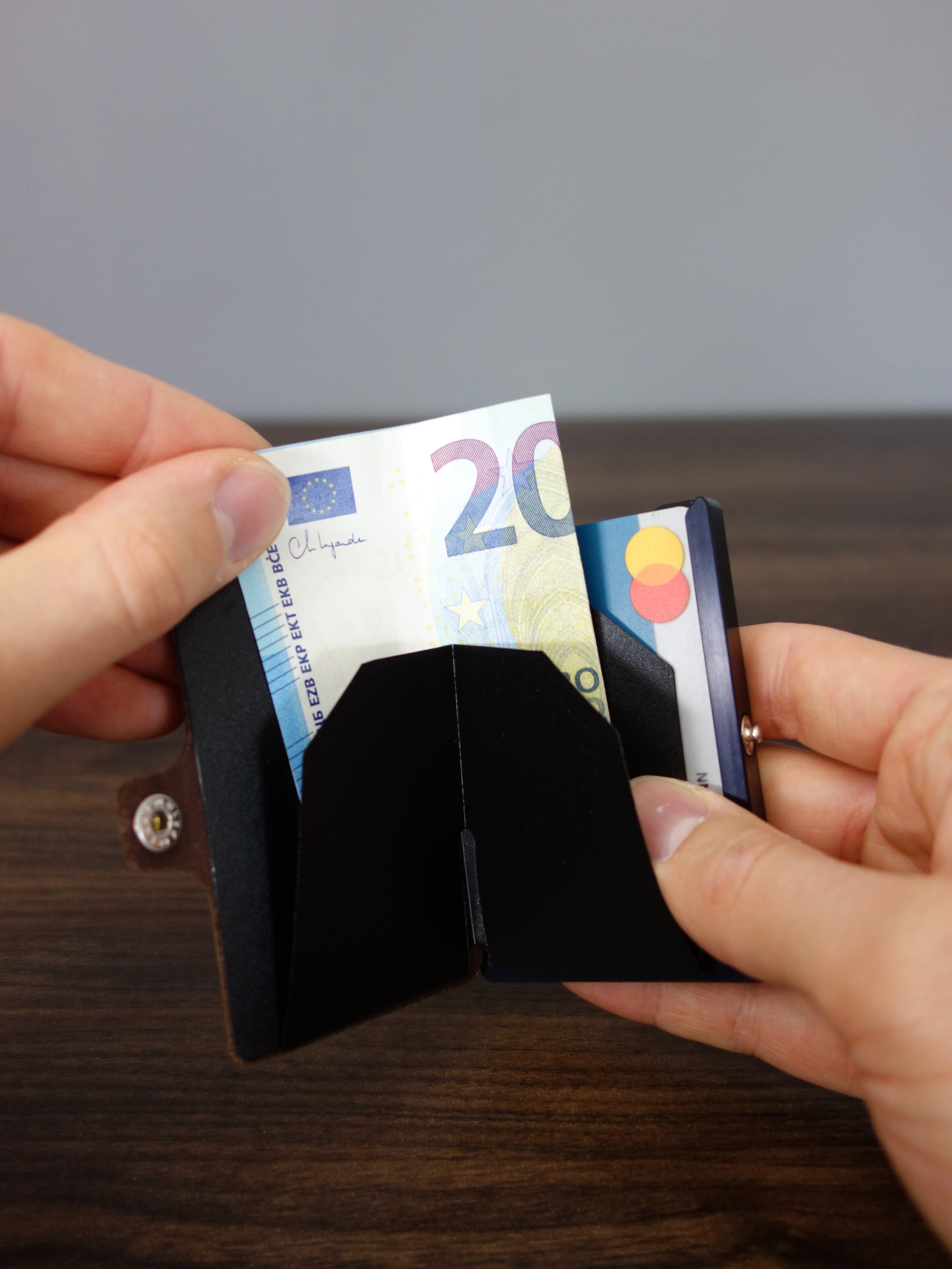 Scheine liegen geschützt im inneren Fach, nicht außen wie bei vielen anderen Wallets.
